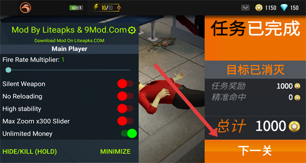 金币可通过剧情/悬赏任务获取,钻石用于解锁高级武器,体力消耗机制鼓励精准射击,爆头奖励与广告回血设计平衡付费与免费体验。