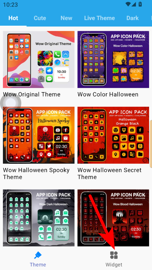 1、在主题和小组件页面,点击底部Widget选项,进入小组件选择界面。