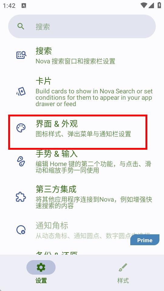 1、进入Nova设置页面,点击界面&外观选项,进入界面&外观设置页面。