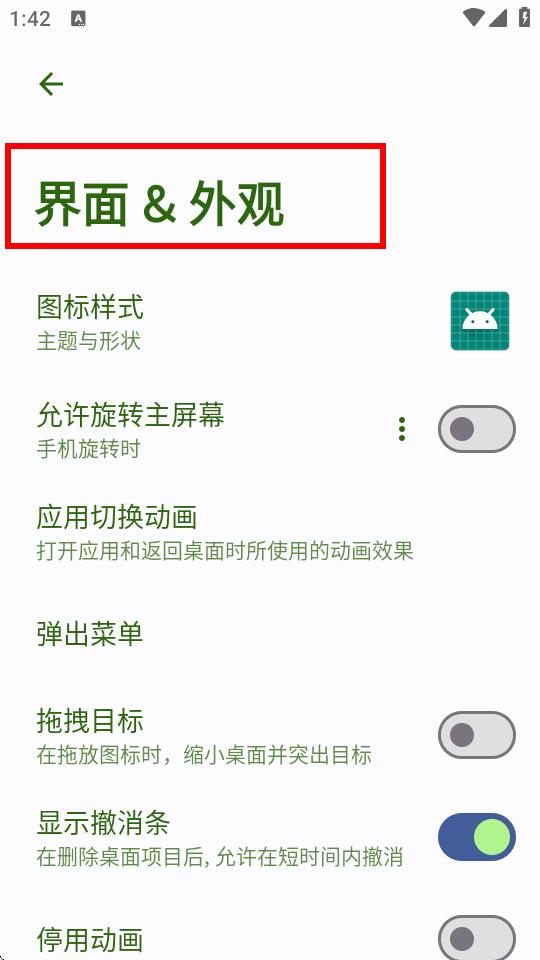 3、在界面&外观设置页面,可对图标样式、应用切换动画等进行设置,打造个性化界面。