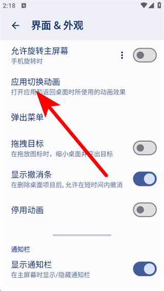 2、在界面&外观设置页面,点击应用切换动画选项,弹出应用切换动画列表。