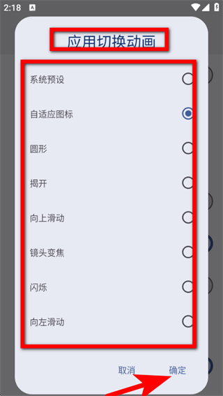 3、在应用切换动画列表中,可选择喜欢的效果,点击确定按钮,即可完成应用切换动画效果的设置。