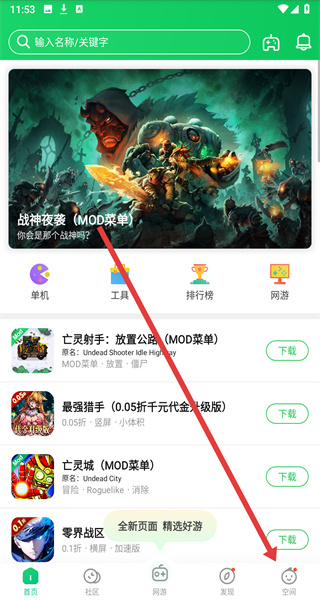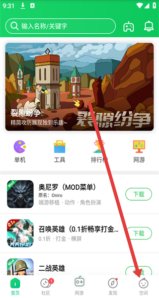 1、在进入到葫芦侠修改器首页中,可以点击底部空间按钮,进入个人空间页面。