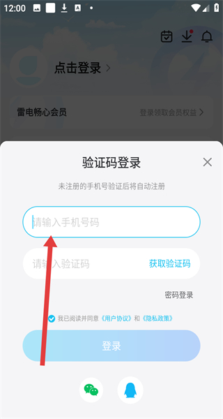 4、在验证码登录窗口中输入手机号码,点击获取验证码按钮后填写,即可完成登录操作。