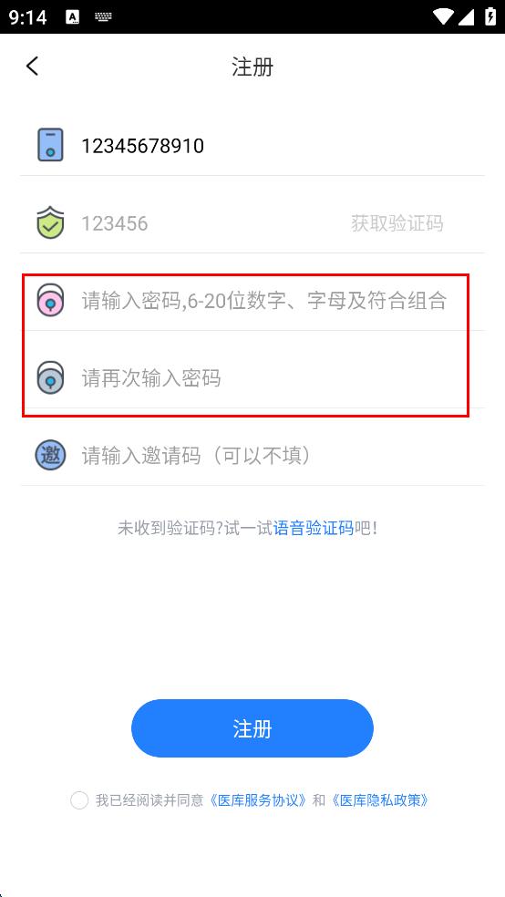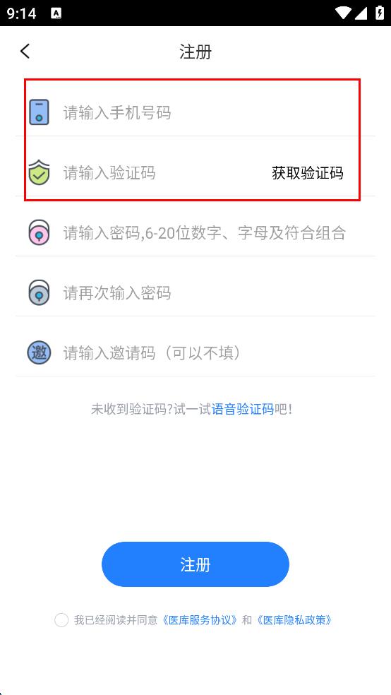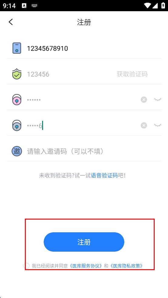 4、勾选我已经阅读并同意医库服务协议和医库隐私政策,点击注册按钮完成注册。