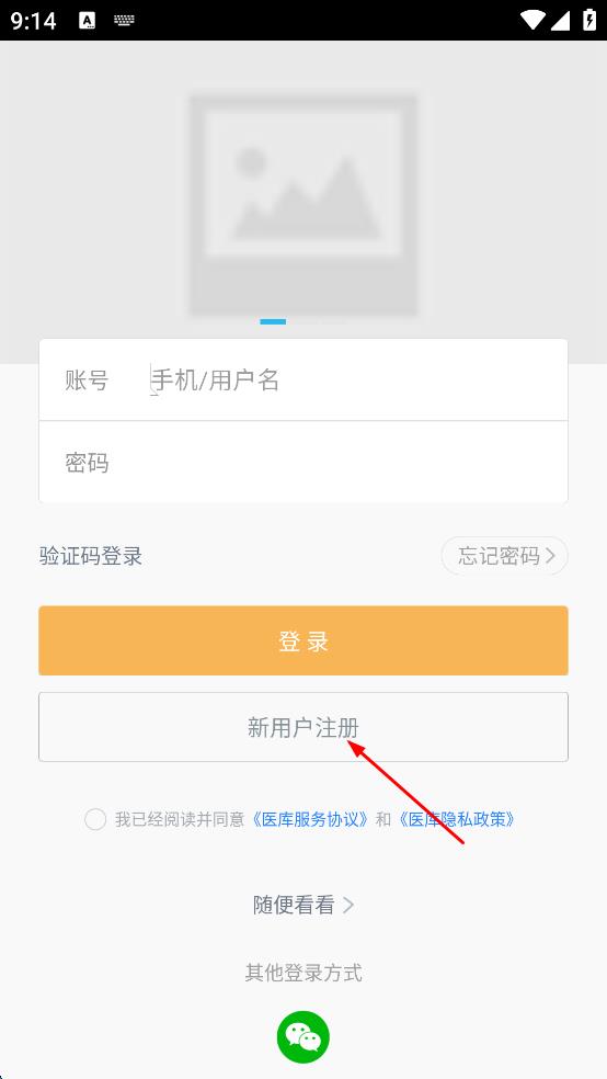 1、打开医库软件,进入登录界面,点击新用户注册按钮,进入注册页面。