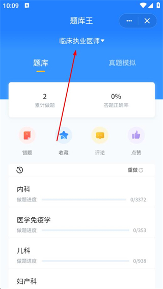 3、进入题库王后,点击临床执业医师下拉框。
