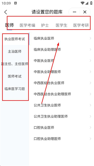 4、选择对应的医师类别和具体考试类型,即可完成题库切换。