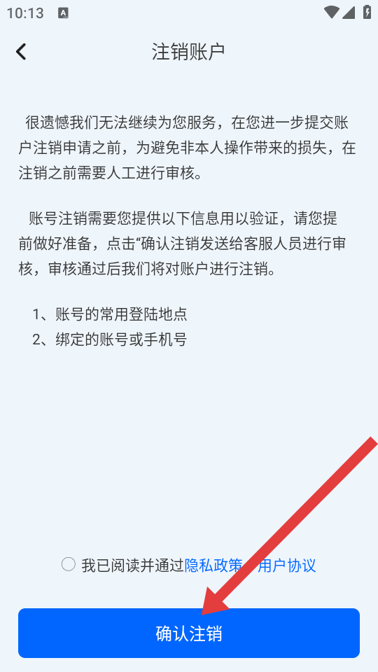 4、在说明页面勾选用户协议后,点击确认注销按钮,提交人工审核完成账号注销。
