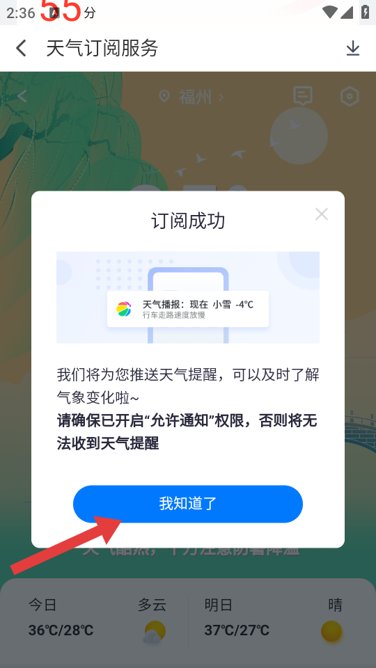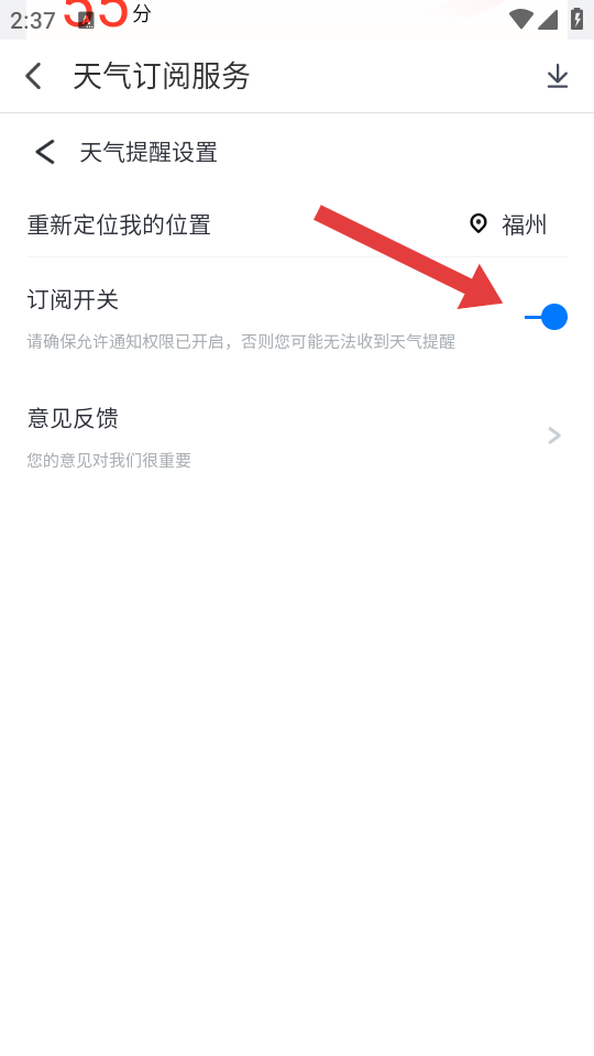 4、最后进入设置页面,确保订阅开关处于开启状态,即可成功订阅并接收天气预报提醒。