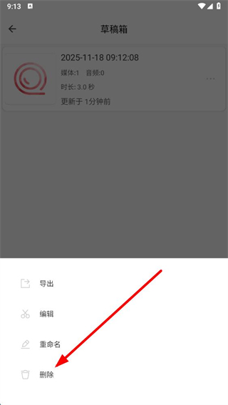 4、在操作菜单中,点击删除,即可完成影剪辑视频编辑草稿的删除操作。