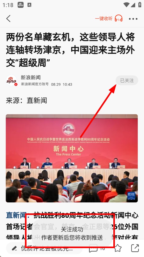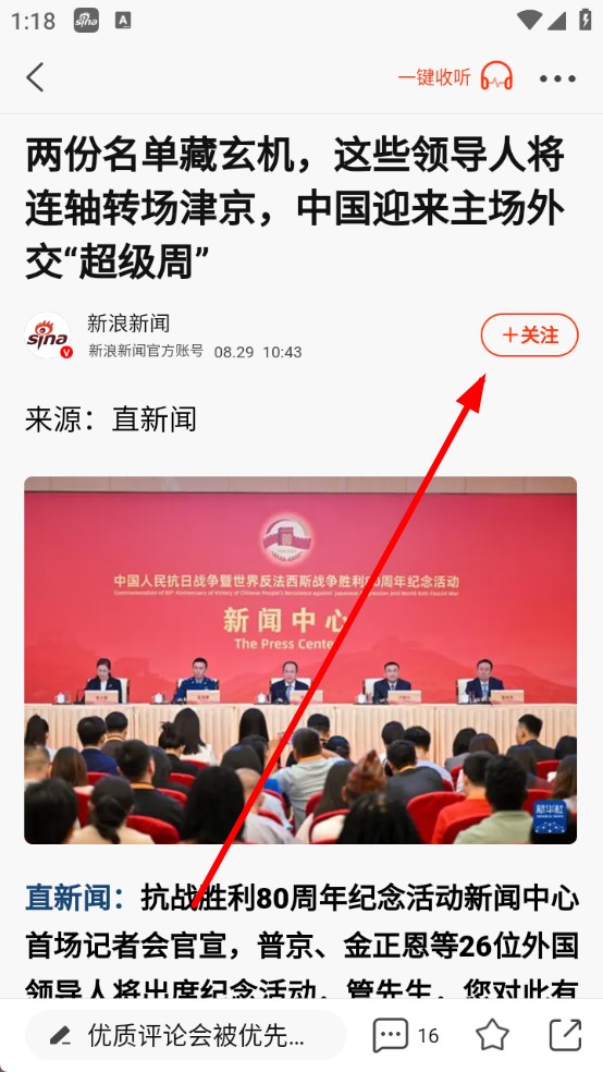 2、进入新闻详情页后,在新闻标题下方,找到发布该新闻的账号名称旁的+关注按钮,点击它。