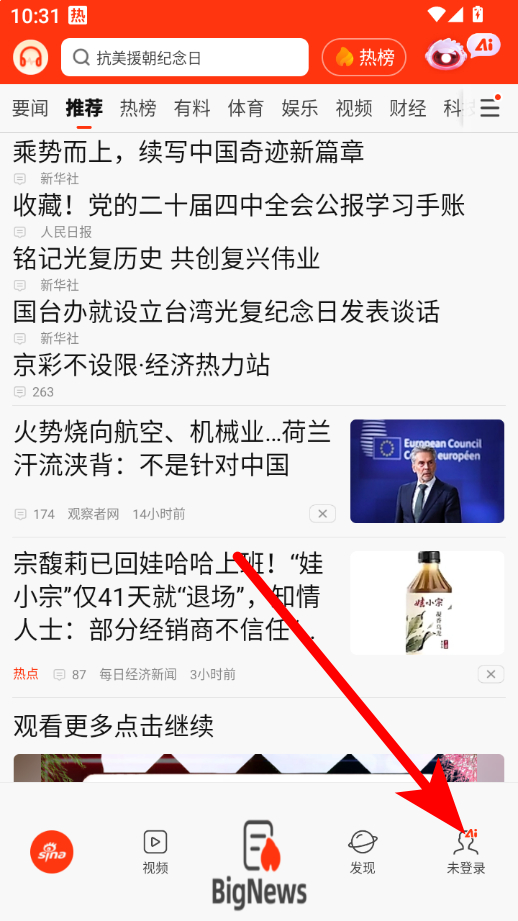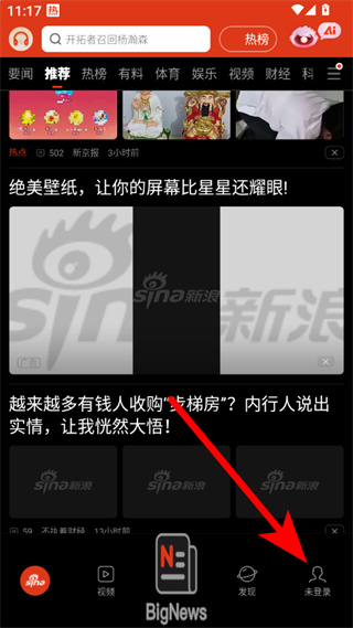 1、在新浪新闻主页面,点击右下角未登录图标,进入个人界面。