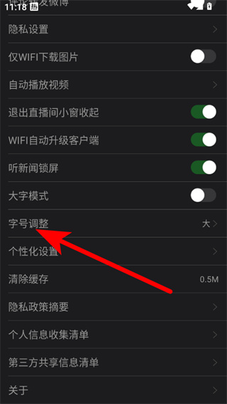 3、在设置界面,点击字号调整选项,进入字号调整页面。
