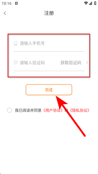 4、在注册页面,输入手机号码和验证码后点击完成,完成注册操作。
