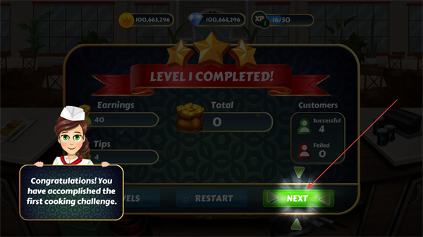 4、完成当前关卡的所有顾客订单后,点击NEXT按钮进入下一关。