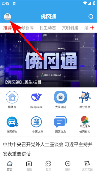 1、在佛冈通app首页,点击左上角头像,进入个人界面。