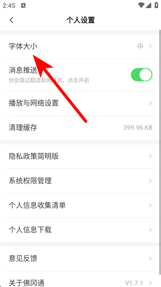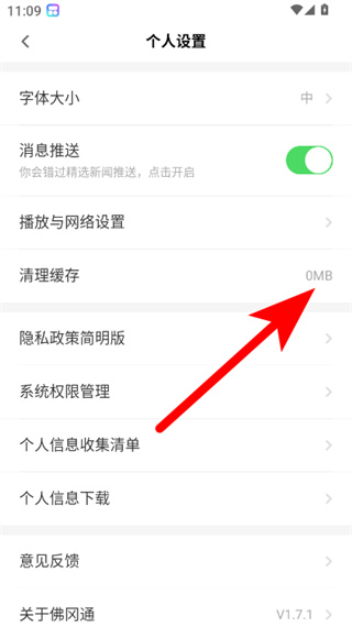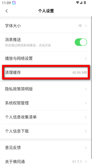 3、在个人设置页面,点击清理缓存选项,进入缓存清理界面。