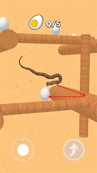 1、操控贪蛇移动,沿红色箭头方向靠近鸡蛋,收集鸡蛋使上方计数从0/5开始增加。