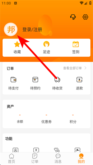 2、在个人的页面中,点击登录/注册的区域,进入登录注册界面。