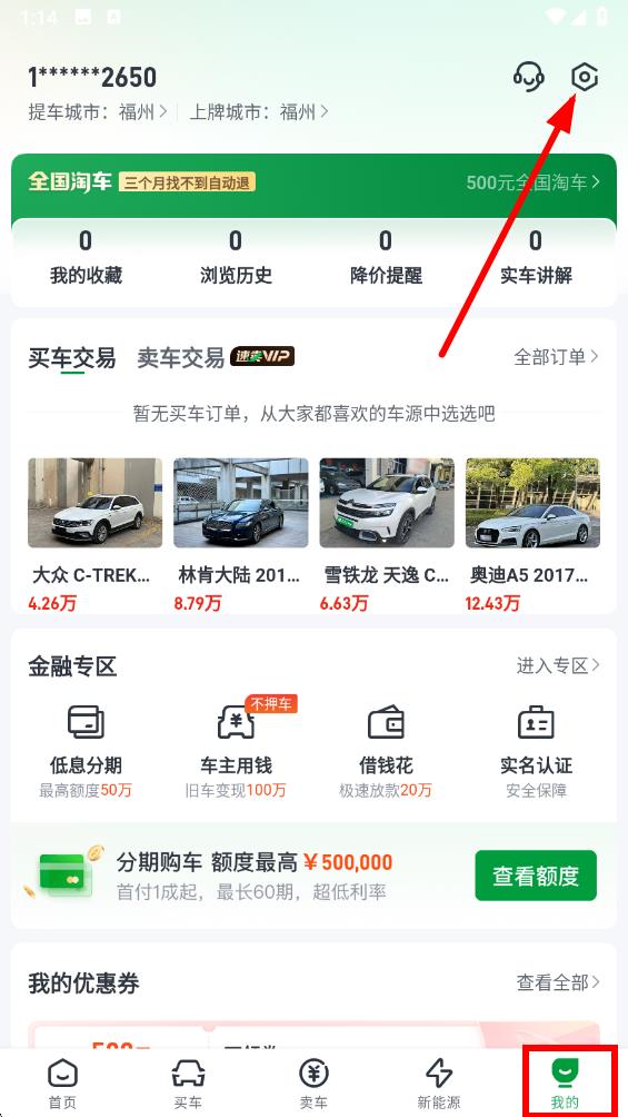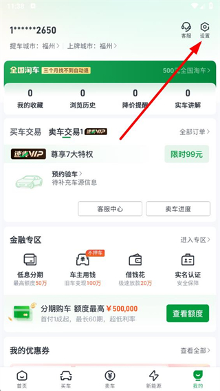 1、打开瓜子二手车app,点击底部导航栏中的我的选项,进入个人页面后点击页面右上角的设置图标。