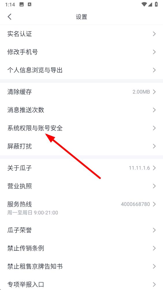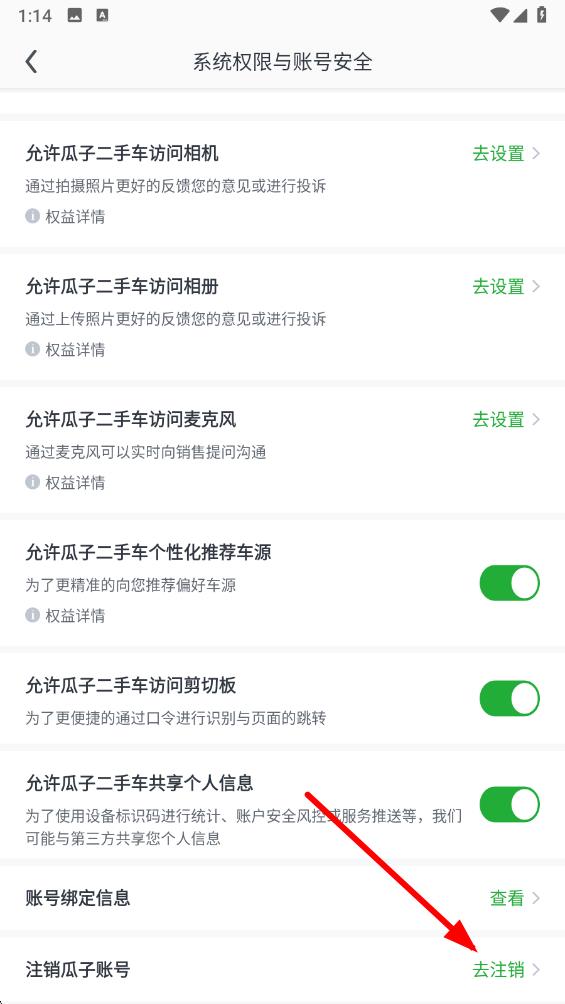 3、在系统权限与账号安全界面里,下滑找到注销瓜子账号选项,点击去注销,按照页面提示完成身份验证等流程,确认注销账号即可。