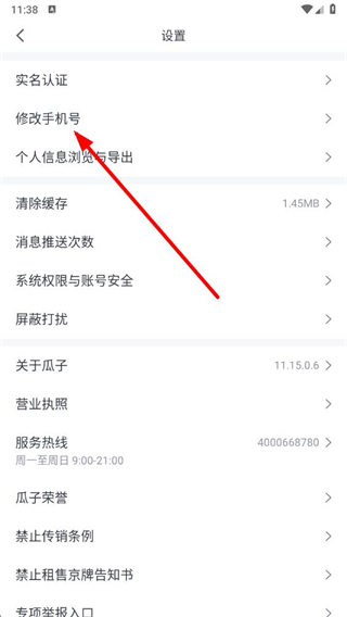 3、在设置界面中,找到修改手机号选项并点击,进入修改手机号流程页面。