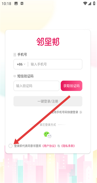 2、在登录界面,勾选登录即代表同意邻里邦《用户协议》与《隐私条款》选项,输入手机号码。