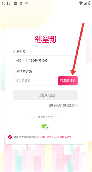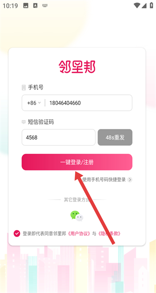 1、点击同意并继续按钮,同意邻里邦的《用户协议》与《隐私条款》,进入登录界面。