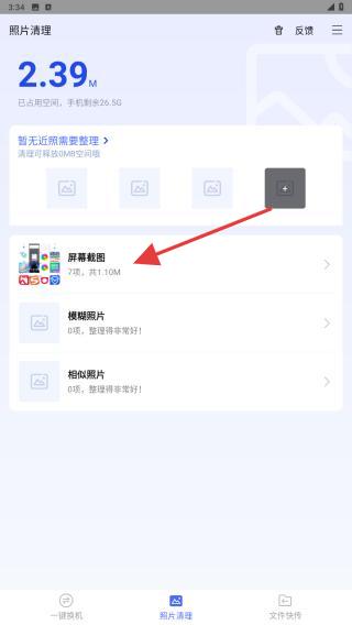 2、进入照片清理页面后,系统会展示可清理的照片类型,如屏幕截图、模糊照片、相似照片等。