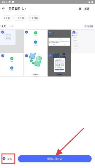 3、手动勾选需删除的照片,或点击左下角全选批量选中,选后点击删除的功能按键即可。