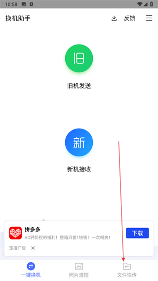 1、打开换机助手APP,点击底部文件快传选项。