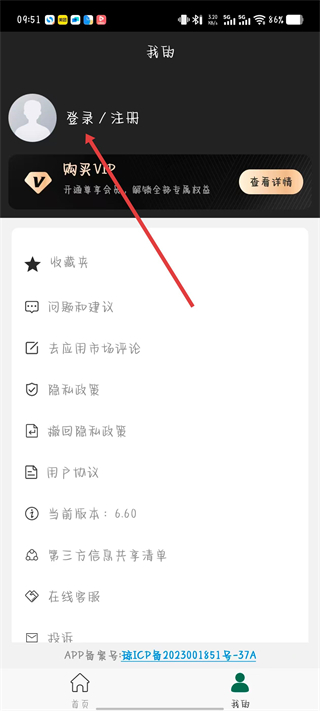 2、进入个人页面后点击登录/注册选项。