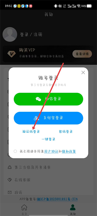 3、在账号登录选择框中点击验证码登录。
