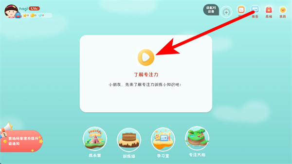 1、在主界面,点击了解专注力的播放按钮,需要先观看完视频。