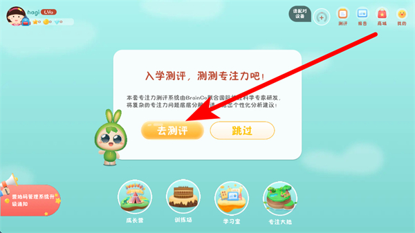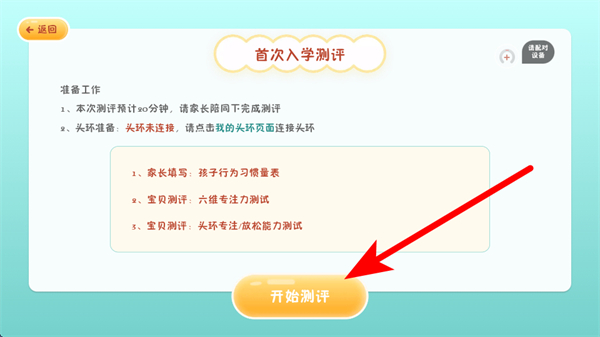 4、在首次入学测评准备页面,点击开始测评,开始进行专注力测评。