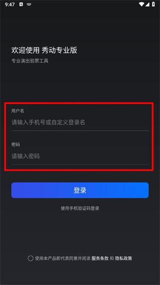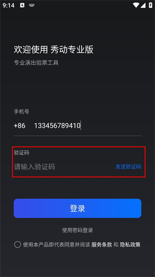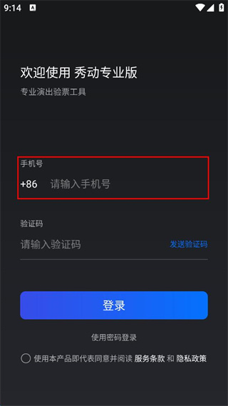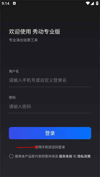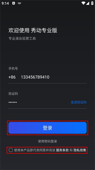 3、勾选同意并阅读服务条款和隐私政策后,点击登录,即可完成秀动专业版的密码登录操作。