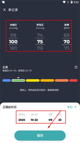 3、在新记录页面,设置收缩压、舒张压、脉搏数值以及日期时间,点击保存。
