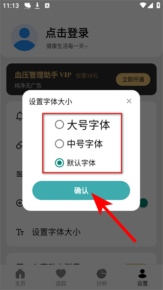 2、在设置页面中,点击设置字体大小选项,弹出字体大小选择窗口。