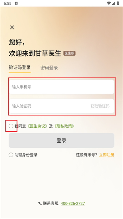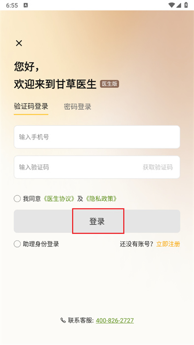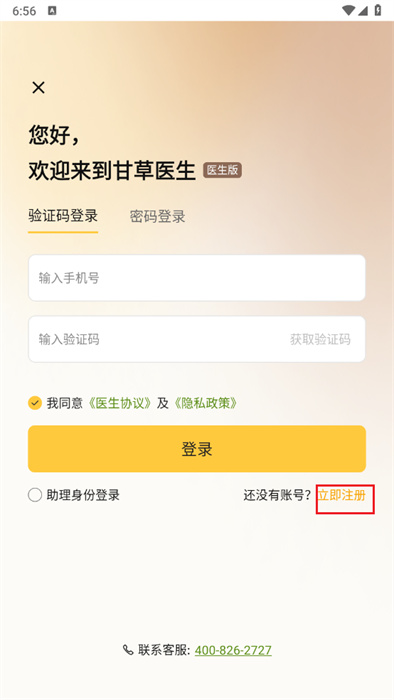 1、打开甘草医生医生版APP,在登录页面点击立即注册选项,进入注册页面。