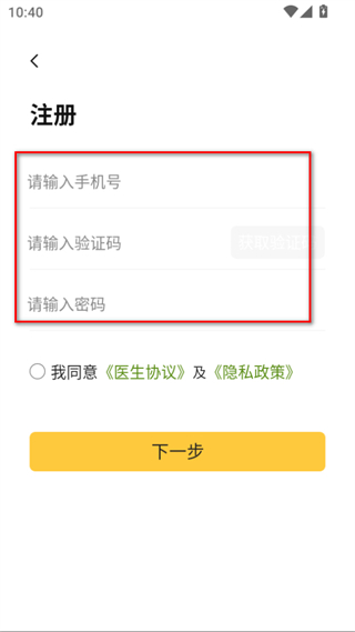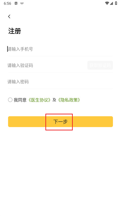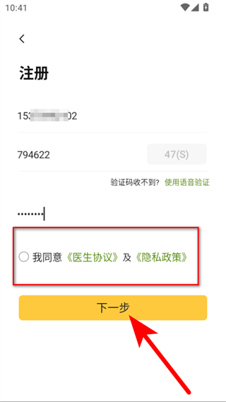 2、在注册页面,依次输入手机号、验证码和密码,勾选我同意医生协议及隐私政策。