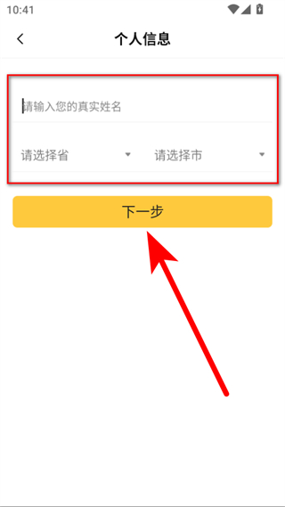 4、在个人信息页面,输入真实姓名,选择所在的省和市,点击下一步按钮,即可完成账号注册。