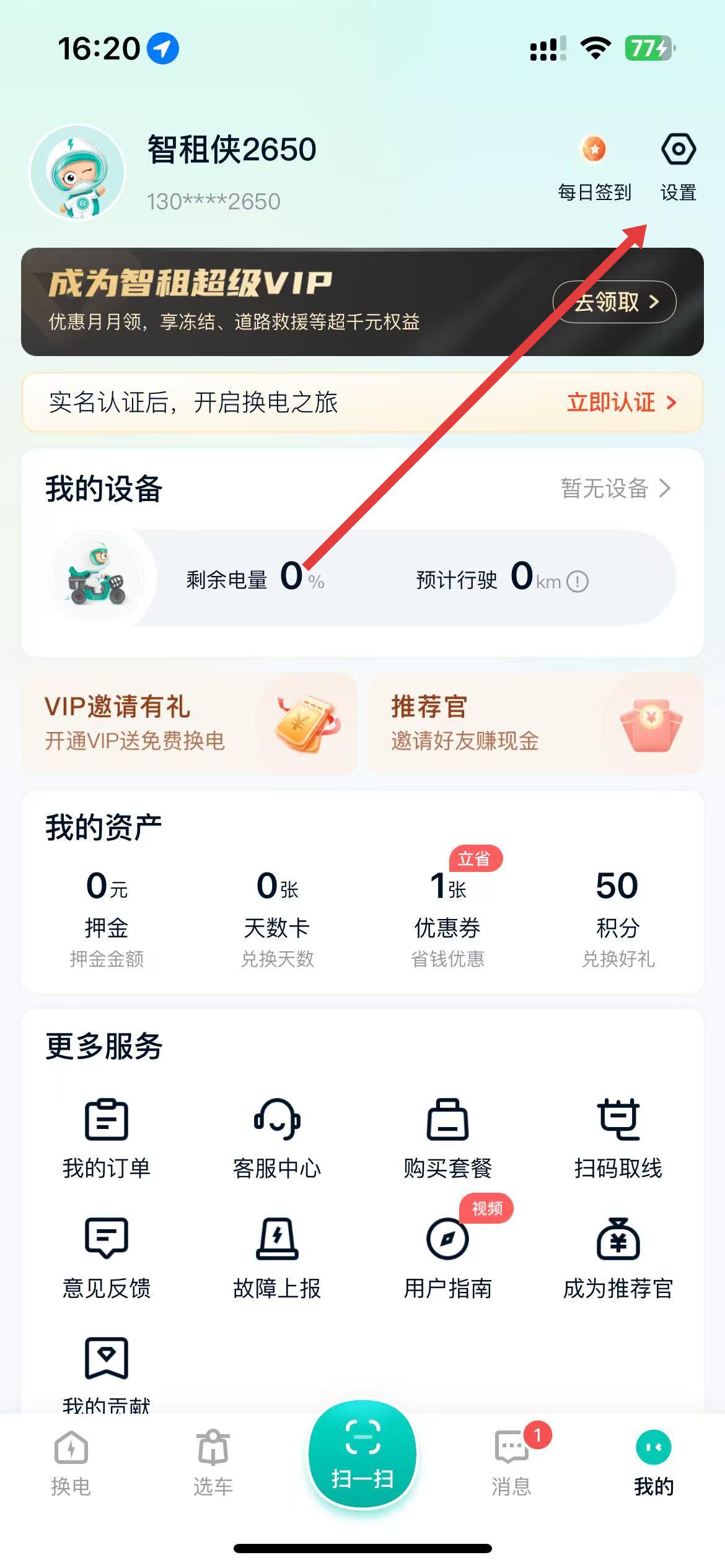 1、打开智租换电APP,点击底部导航栏中的我的选项,进入个人相关界面。