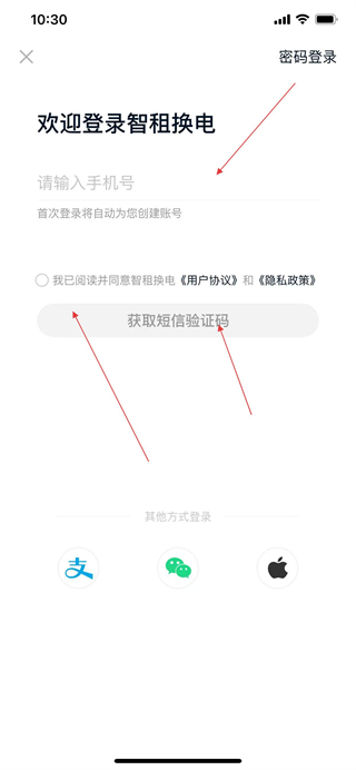 1、打开智租换电APP,点击立即登录,进入登录页面。