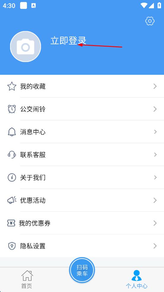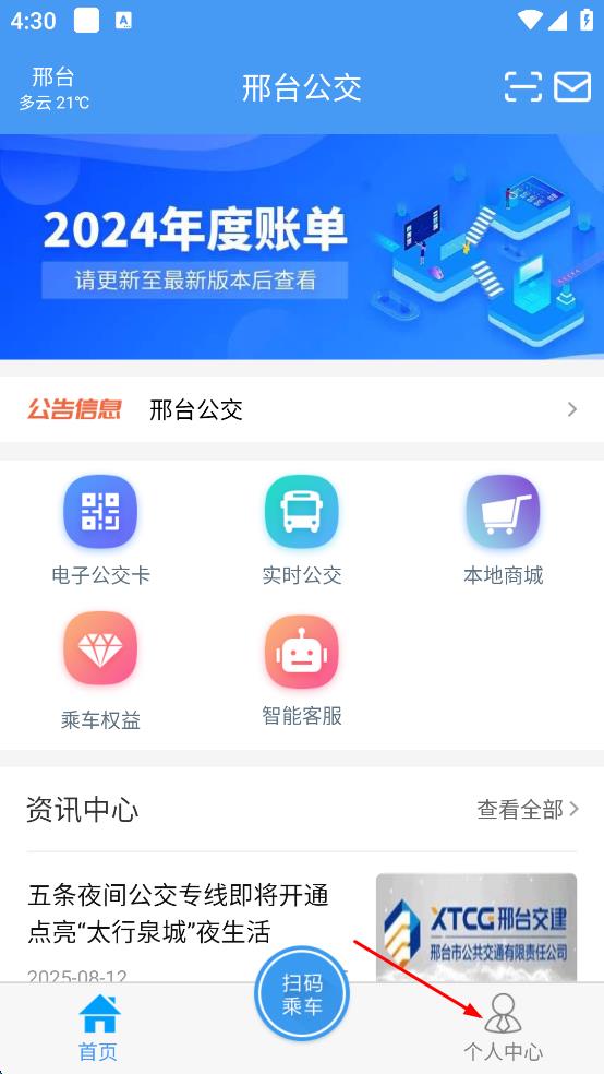 1、打开邢台公交APP,在首页点击右下角“个人中心”选项,进入个人中心页面。