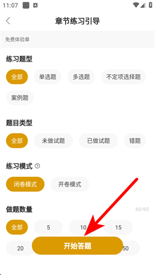 3、在章节练习引导页设置后,点击开始答题,进入答题流程。