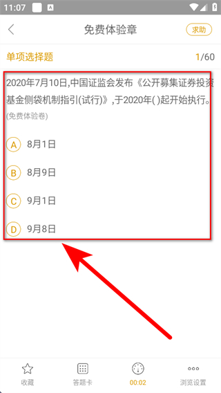 4、进入答题界面后,针对题目选择答案,开启证券知识练习之旅。