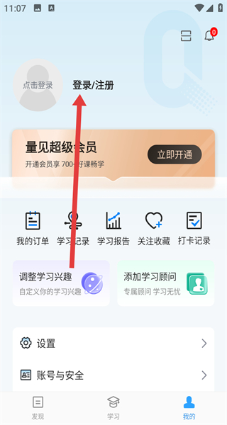 1、打开量见云课堂APP,点击底部导航栏最右侧的我的,进入个人页面。