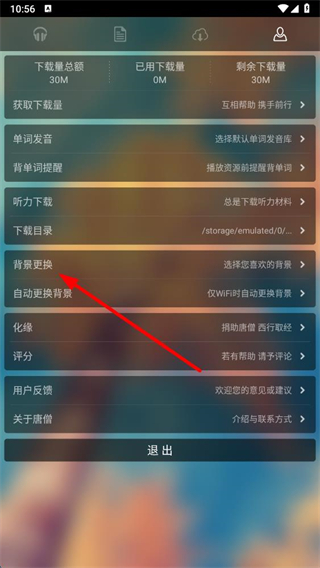 2、在个人设置页面,点击背景更换,进入更换背景页面。