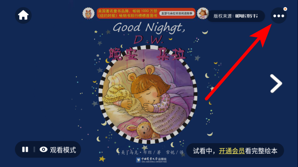 3、在绘本阅读页面,点击右上角的三个点图标,展开功能菜单。